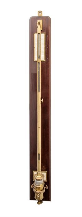 Barometro a mercurio di tipo Fortin con pozzetto di diametro di 6.6cm e tubo di 1 cm di diametro. E' fissato ad una tavoletta di legno di palissandro 13x110 cm su cui sono applicata due piastrine in carta di contrasto per la lettura della scala graduata e del livello del mercurio nel pozzetto. Alla scala graduata è associato un nonio regolato da una vite micrometrica. Manca il termometro a mercurio.