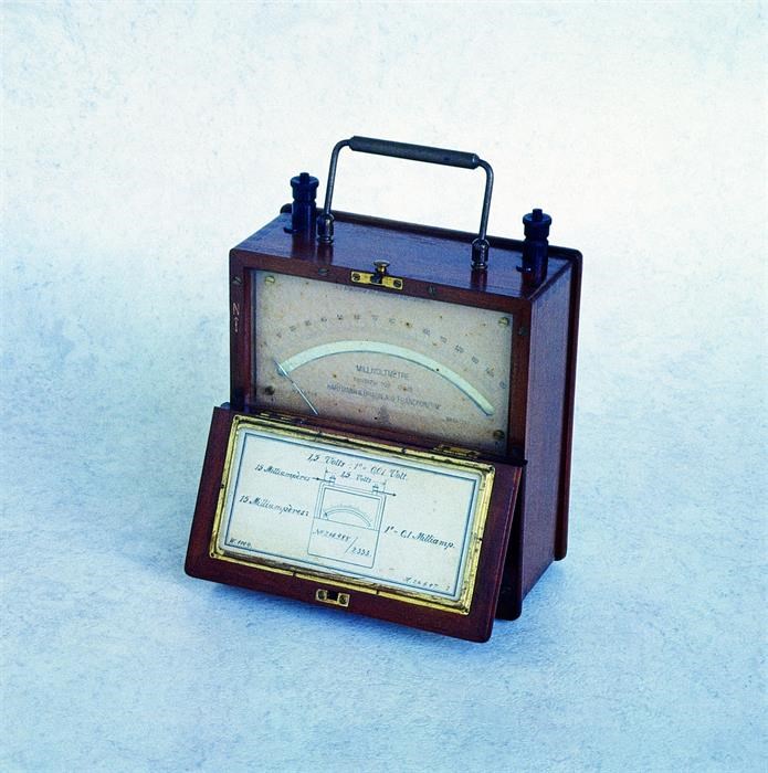 Lo strumento è inserito in una cassetta in legno di noce. Sulla parte superiore presenta una maniglia pieghevole in ottone dorato, due morsetti d'ingresso del segnale in bachelite ed un pulsante, tramite il quale si apre frontalmente uno sportellino. Lo sportellino aperto, mostra, attraverso un vetro di protezione, un visore a scala lineare con specchio (per evitare in lettura l'errore di parallasse) ed un indice a coltello. La classe di precisione dello strumento è di 1%, con portata amperometrica di 15 mA fs e con portata voltometrica di 1,5 V fs. Sulla parte interna lo sportellino, protetto da un vetro ed una sottile cornice in ottone dorato, presenta una targhetta su cui vengono illustrate, con un disegno, le caratteristiche dello strumento, il numero di serie "N° 246988/2333" e la data di costruzione "24.06.07". Nella parte inferiore della scatola vi è una vite di taratura a zero dell'equipaggio mobile.